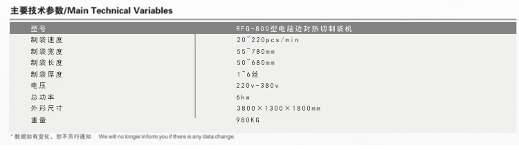 適用于PE、PP、OPP、BOPP、OPF等塑料材料自動(dòng)熱切制作的針織、服裝、食品、文具等包裝,是目前替代進(jìn)口同類產(chǎn)品的先進(jìn)制袋設(shè)備。