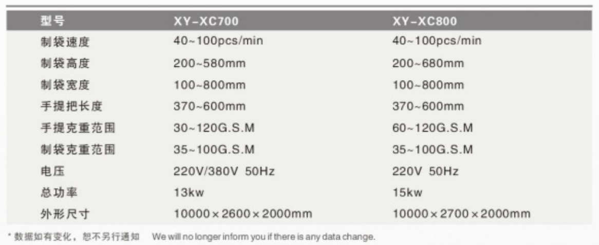 該機適用原材料為無紡布,能加工各種不同規(guī)格,不同型狀的無紡布袋,平口袋,拉鏈袋等,該機集機電為一體,運用LCD觸模屏操作。配以步進步式定長,光電跟蹤,電腦自動定位,電腦自動糾邊,準確,平穩(wěn)。自動計數(shù)即可設(shè)定計數(shù)報警,自動打孔等工控裝置,使其生產(chǎn)的成品封線牢固,切線美觀。高速效,是你可以放心適用的優(yōu)質(zhì)環(huán)保型制袋設(shè)備。